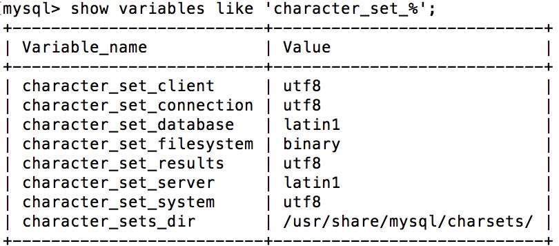 如果服务没有出现乱码,那么说明是数据库的语言配置出问题了,可以通过show variables like 'character_set_%';来查看数据库的编码